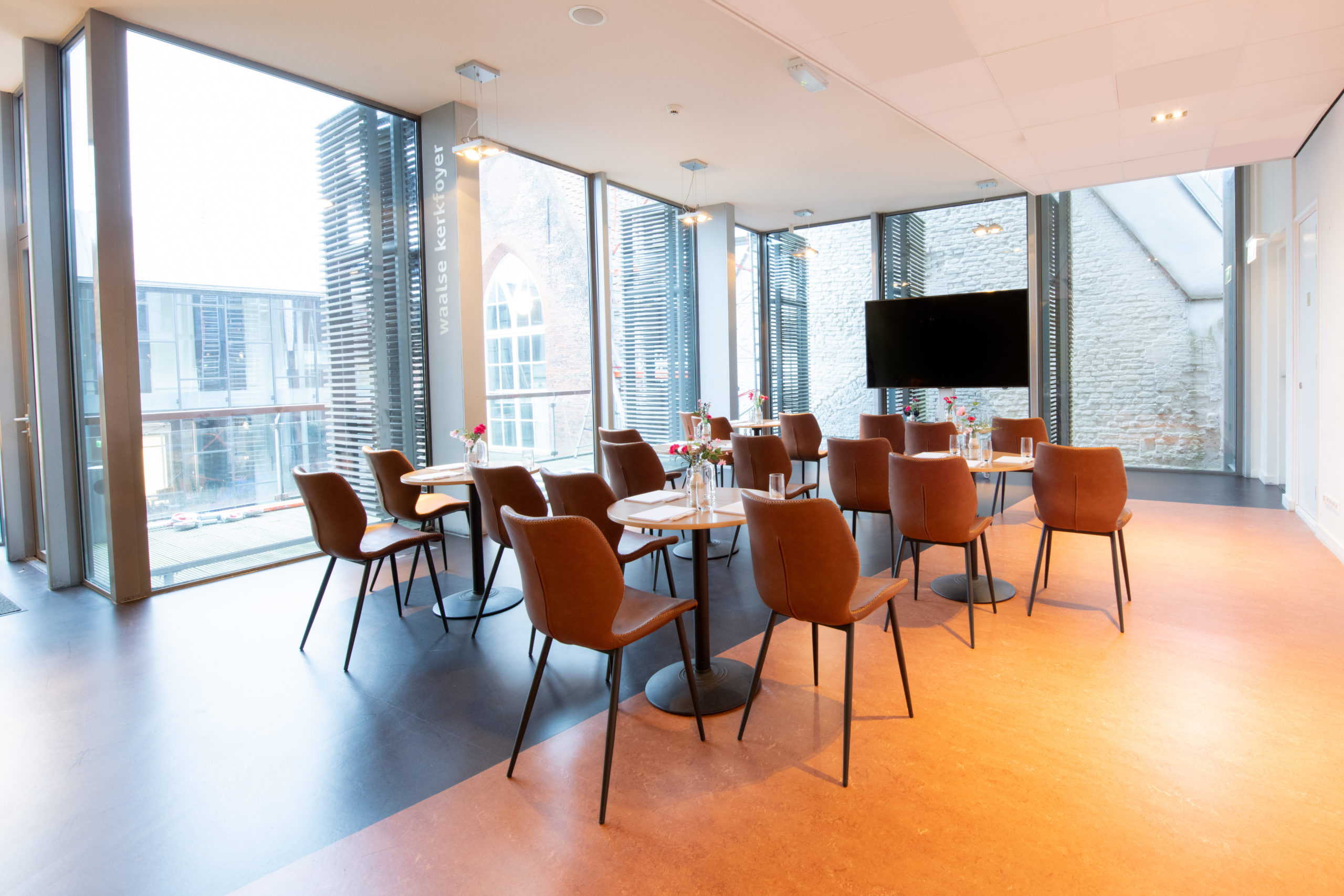- Een gedeelte van deze foyer is met een schuifwand af te scheiden tot de Waalse Kerkfoyer, waarmee u ook tijdens uw congres in de Aalmarktzaal een kleinere break-out-ruimte kunt creëren.