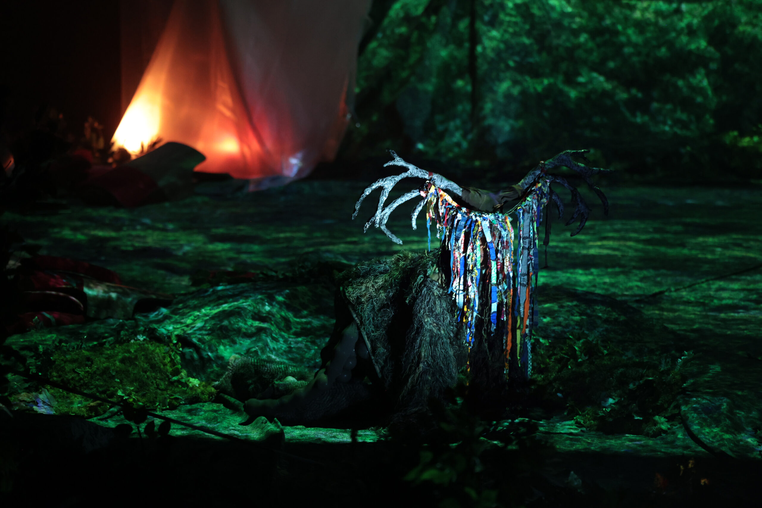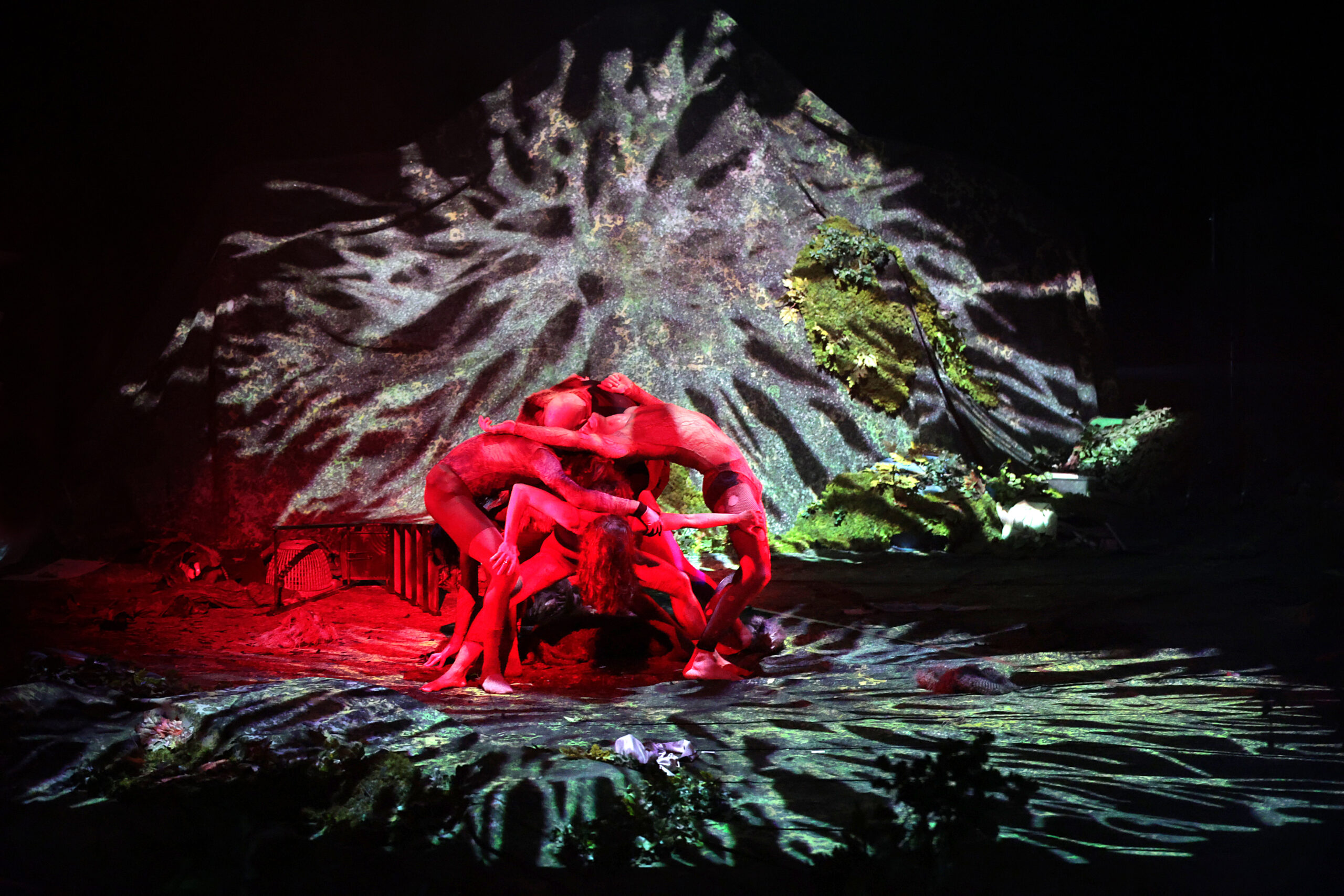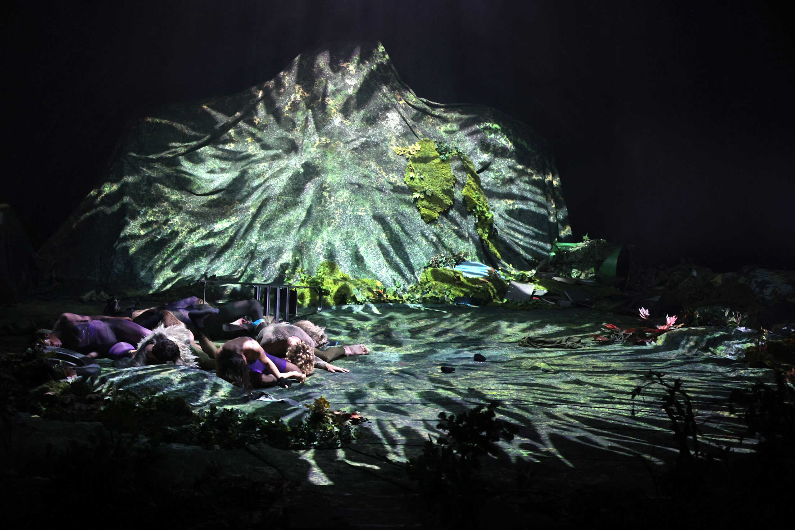 In Atmen, Nicole Beutler welcomes you to an undiscovered piece of the future; it is the year 2200. You are welcomed to a pulsating, vibrating and breathing paradise in which nature has reclaimed its place. The red plush in the theatre auditorium is now part of a living ecosystem. The ruin of what was once the theatre has been overgrown by bacteria, flora, fauna and shiny fungi. Together with hybrid creatures, the audience becomes part of this ecosystem, in which the four singers of the award-winning dance opera 8: METAMORPHOSIS sing romantic songs of nature.